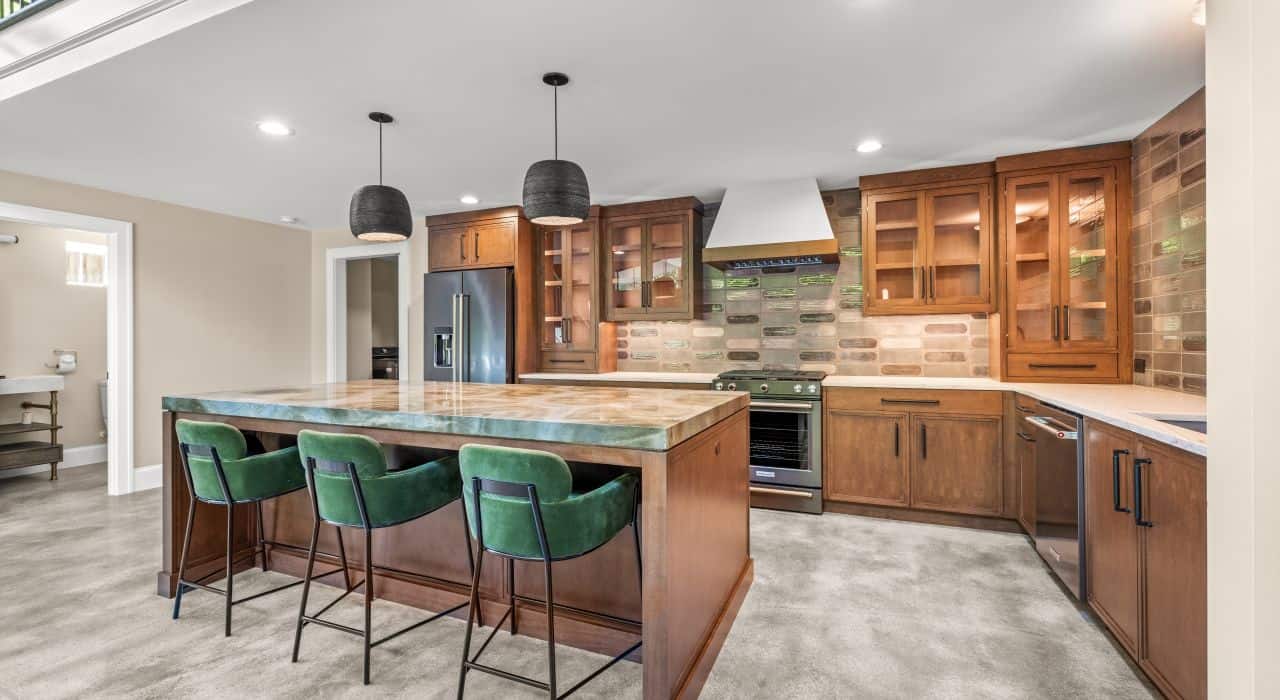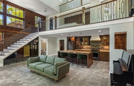 The main level’s open floor plan was thoughtfully designed to accommodate a variety of activities and serves as the primary gathering and entertainment space. The interior includes a sophisticated and modern custom kitchen featuring a large kitchen island with gorgeous blue and green Quartzite mitered edge countertops and green velvet bar stools, full overlay maple cabinets with modern slab style doors and large modern black pulls, white honed Quartz countertops with a contemporary and playful backsplash in a glossy-matte mix of grey 4”x12” tiles, a concrete farmhouse sink, high-end appliances, and stained concrete floors.