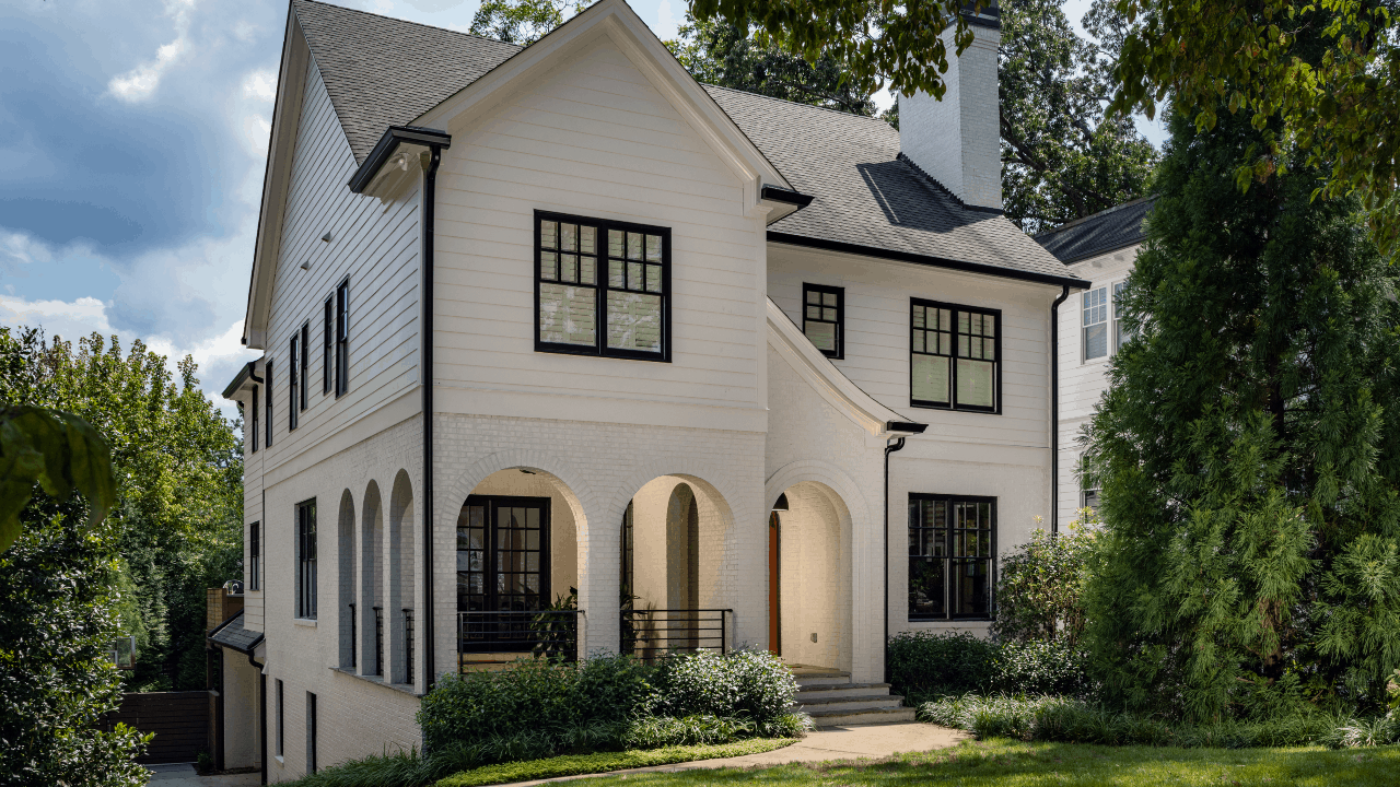 The facelift began in the front of the house by removing the English Tudor paneling with Hardie Board siding and black Mira TEC trim. We added a custom contemporary railing to the porch, a new mailbox, updated the landscaping and completed this stunning exterior renovation with a concrete paver driveway.