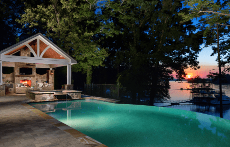 This custom outdoor living space and infinity edge pool was the perfect addition to this beautiful home on Lake Lanier. The backyard of the home was previously under-utilized and had no appeal or function. The homeowners contacted us to create a space that fit seamlessly with the natural beauty of the lake. They wanted to have a large fireplace and entertaining area to accommodate friends and family around the pool while overlooking the lake. We designed the infinity edge pool to create a panoramic view over the lake while also providing a cascading water feature that is viewable from the lake area. The impressive outdoor fireplace and kitchen serves as the focal point of the cabana. The custom pool and spa provide an amazing space to relax and enjoy the comforts of lakefront living.