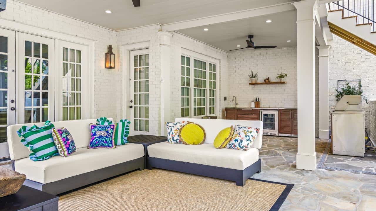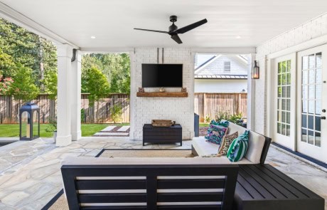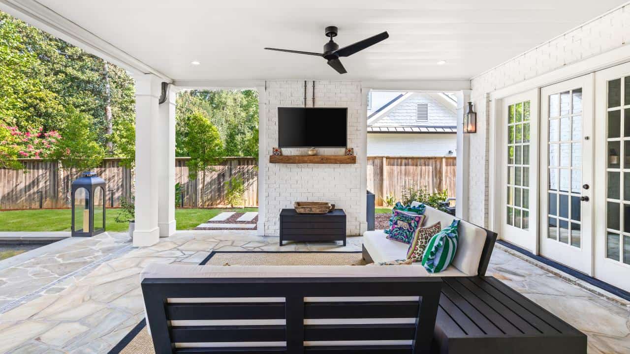 The outdoor living continues under a spacious covered porch with a tongue-and-groove ceiling, a cozy painted brick fireplace and a mounted TV, making it the perfect year-round gathering spot. This area blends comfort and style, providing shade in the summer and warmth in cooler months, seamlessly extending the home’s living space into the backyard.