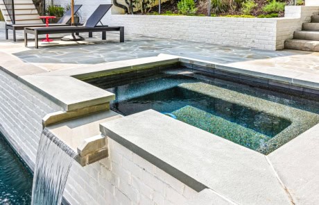 The custom pool design features Black Onyx PebbleTec® for a rich, dramatic finish that contrasts beautifully with the surrounding lush landscaping. Along the waterline, Lavagna Black pool tile adds depth and elegance, while modern wall scuppers and a sheer descent waterfall creates soothing movement and sound. The elevated spa, set flush with the patio, integrates seamlessly into the layout while serving as a striking architectural focal point.