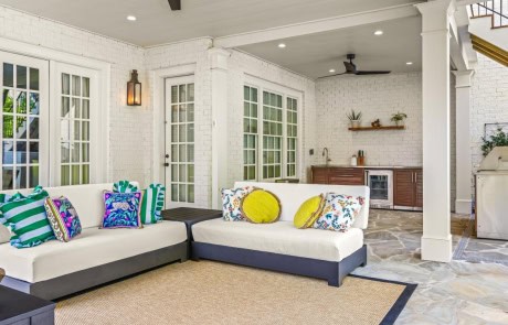 Features: Rectangular Modern Pool & Spa with Spillover, Tanning Ledge, Modern Black Wall Scuppers, Premium Pool Finishes, Separate Outdoor Dining & Outdoor Living Areas, Bluestone Stepper Staircase, Covered Flagstone Paver Patio with Painted Brick Fireplace & Reclaimed Wood Mantle, Tongue & Groove Ceiling, Integrated Can Lighting, Ceiling Fans, Privacy Screen Wall, Low Voltage Lighting and Landscaping