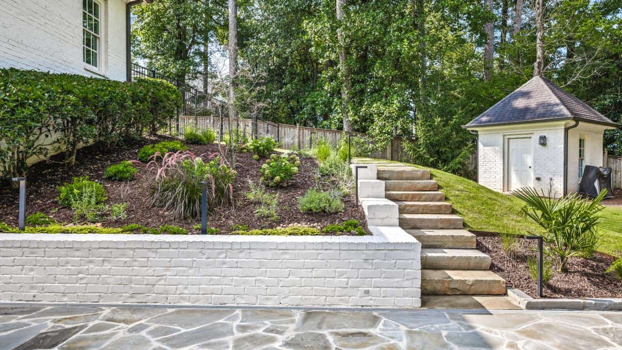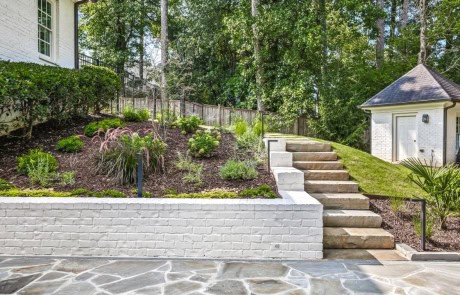 To complement the pool, a retaining wall with decorative water features enhances the visual appeal while addressing the property’s slope. Wide Bluestone steps and a stone patio create a natural transition between outdoor living zones, connecting the pool deck to the covered lounge and dining areas. A stepper staircase ties the elevated spaces together, adding both function and architectural interest.