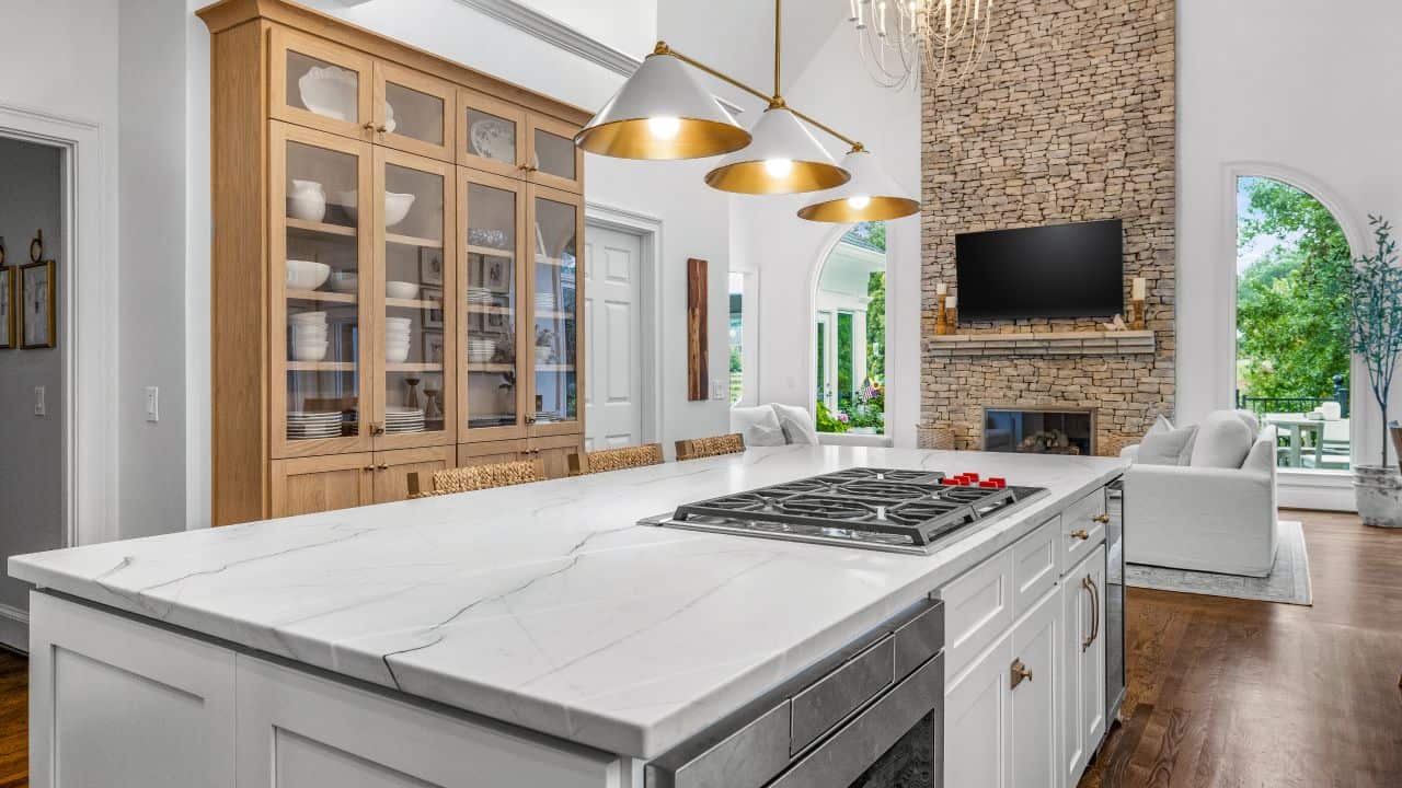 The oversized kitchen island features Le Blanc Quartzite countertops and is equipped with a top-of-the-line, Wolf, 5 burner professional gas cooktop and a sophisticated 3-light chandelier adorned with white and brass cone-shaped shades overhead. Traditional Teak and basketweave rattan counter stools make it a popular gathering spot for casual dining, entertaining and the kids’ homework sessions.